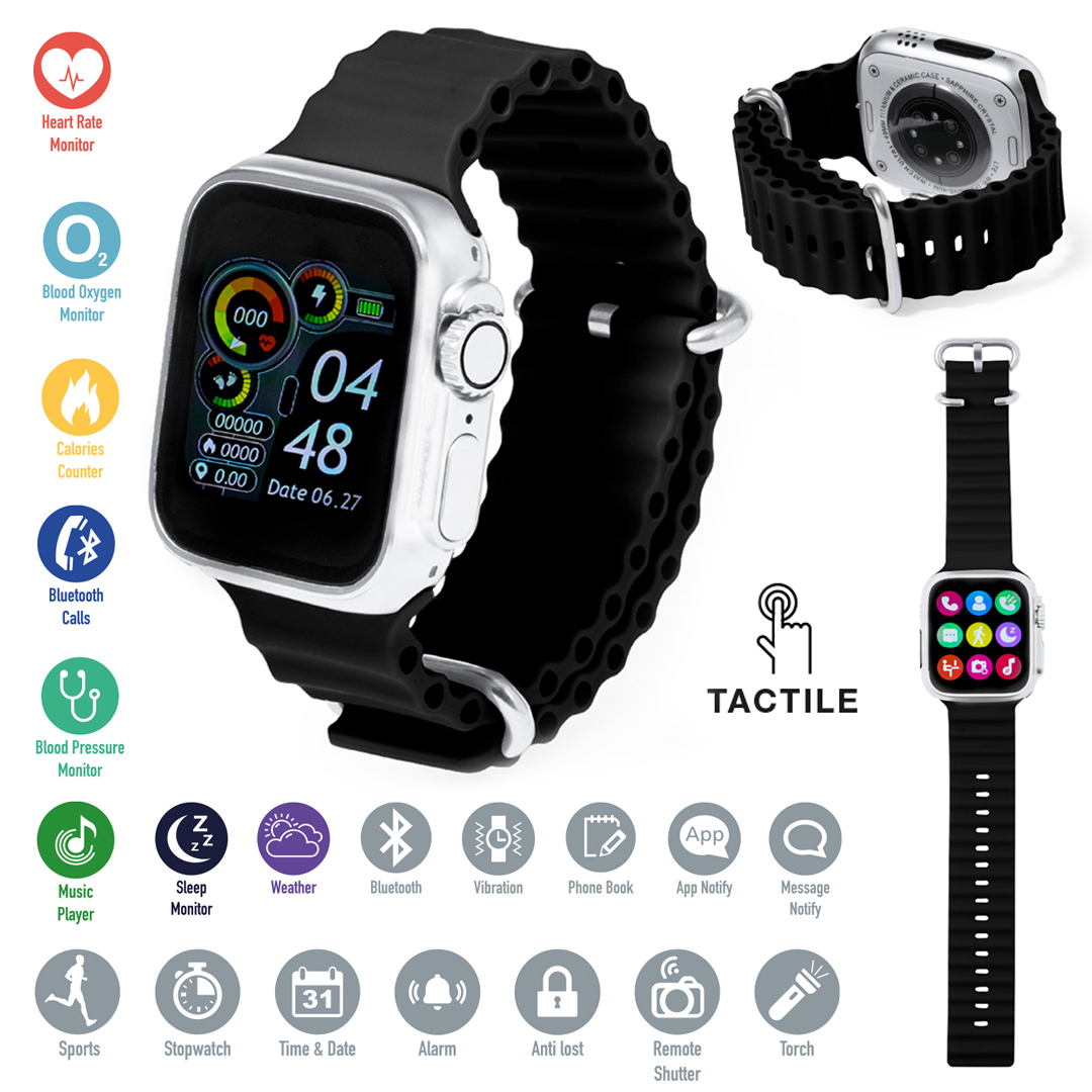 Reloj inteligente multifunción de diseño casual, con conexión Bluetooth® 5.3 y recargable mediante conexión inalámbrica (cargador incluido). Elegante carcasa metálica, con correa en material TPU y pantalla TFT táctil de 1,83 pulgadas, ofreciendo una vibrante experiencia visual. Batería de 180 mAh de larga duración.Resistente a salpicaduras de agua, con APP disponible para iOS y Android. Base de carga incluida y presentado en atractiva caja de diseño kraft. Disponible manual de instrucciones en español e inglés. Conexión Bluetooth. Pantalla TFT 1,83". Recargable Inalámbrico. Batería 180 mAh