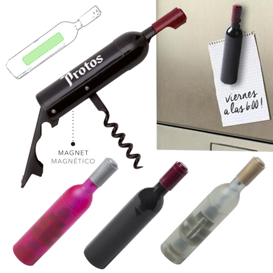 Divertido sacacorchos magnético con forma de botella de vino en diseños blanco, tinto y rosado. Con cuerpo en original acabado translúcido y función abridor. Magnético