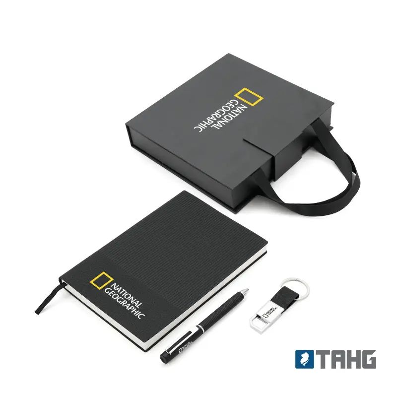 Elegante set que incluye un cuaderno A5 rayado (80 g, 100 hojas, 21 x 14 cm), un lapiz de tinta azul y un llavero, todo presentado en una caja negra mate con correas para transportar fácilmente. Es un producto ideal para regalar en eventos corporativos o fechas especiales.