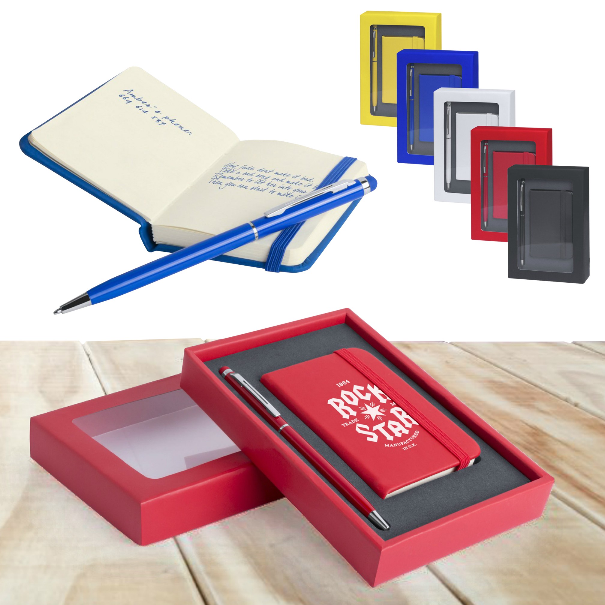 Set de bloc de notas con tapas de suave tacto acabadas en polipiel y bolígrafo de aluminio con puntero a juego. De 80 hojas lisas con elástico de sujeción y marcapáginas de tela a juego. Presentado en elegante estuche de cartón con ventana a juego y de suave espuma troquelada. Bolígrafo con tinta azul. Portada Rígida. Bloc 80 Hojas