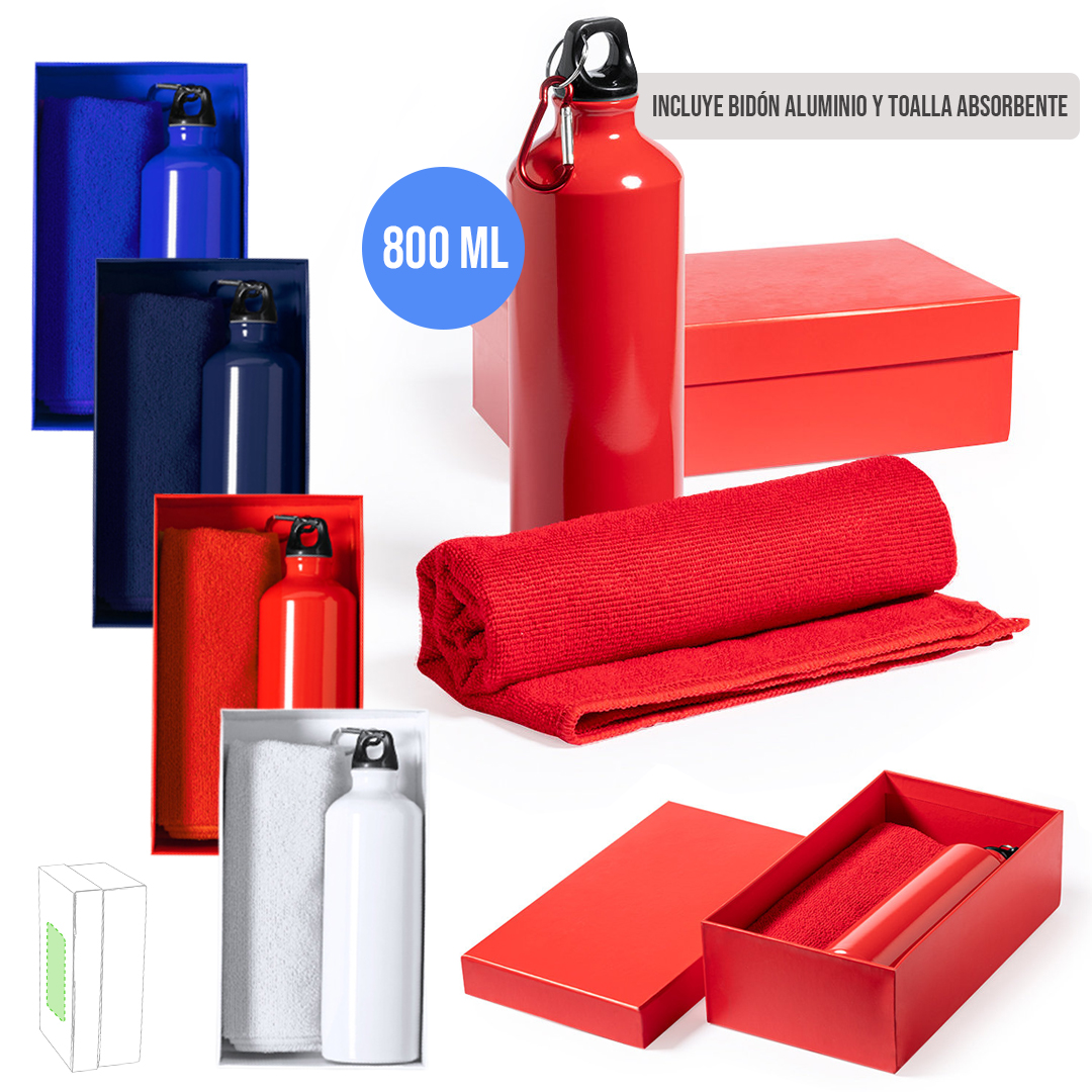 Set de bidón y toalla a juego. Incluye: Bidón de 800 ml de capacidad con cuerpo en aluminio de acabado brillo. Con tapón de seguridad a rosca y mosquetón metálico de transporte. Toalla absorbente fabricada en microfibra de 160g/m2 y tamaño 40x90 cm. Set disponible en variada gama de colores y presentado en caja de cartón con colores a juego. Bidón Aluminio 800 ml. Toalla Absorbente Microfibra 160 g/ m2