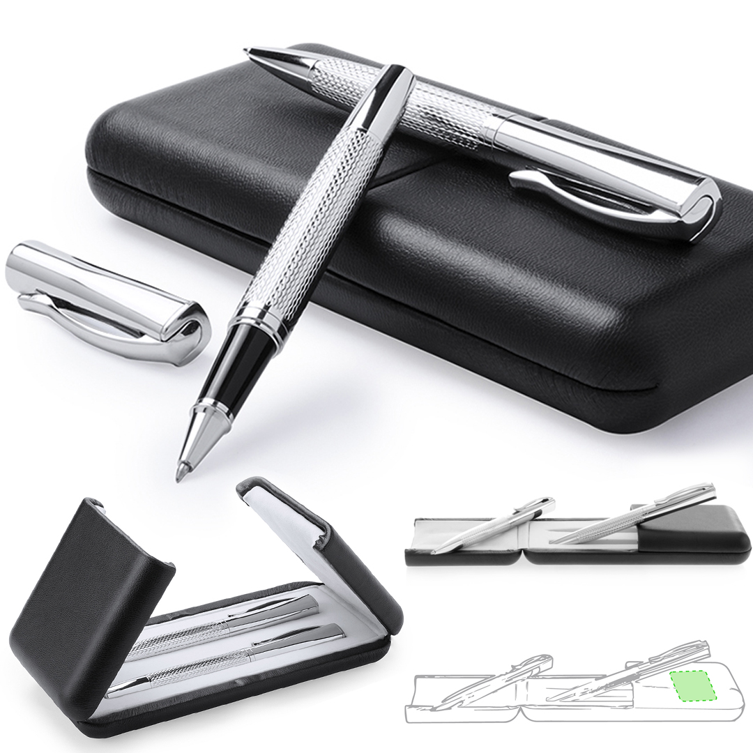 Elegante set de bolígrafo de mecanismo giratorio y roller de capucha en sobrio diseño. De cuerpo metálico antideslizante en acabado plateado brillante con clip a juego. Presentado en elegante y original estuche individual de polipiel en color negro con interior troquelado en suave antelina blanca. De cartucho jumbo con tinta azul de calidad alemana. Bolígrafo y Roller. Carga Jumbo