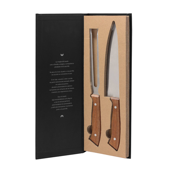 37,8 x 13 x 2,8 cm (caja cerrada). Acero inoxidable 420 y Madera de Acacia. Set de 2 utensilios: Cuchillo chef de 33,5 cm y 175 g. Tenedor de 31,3 cm y 125 g., ambos con mango de madera. Presentación en caja de regalo estilo libro.