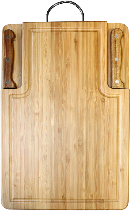 38 x 25 x 2,5 cm. Bambú. Set parrillero con tabla con manija de metal, cuchilla de 20 x 2,5 y tenedor asador de 18,5 cm con mangos de madera.Presentación en caja de regalo.