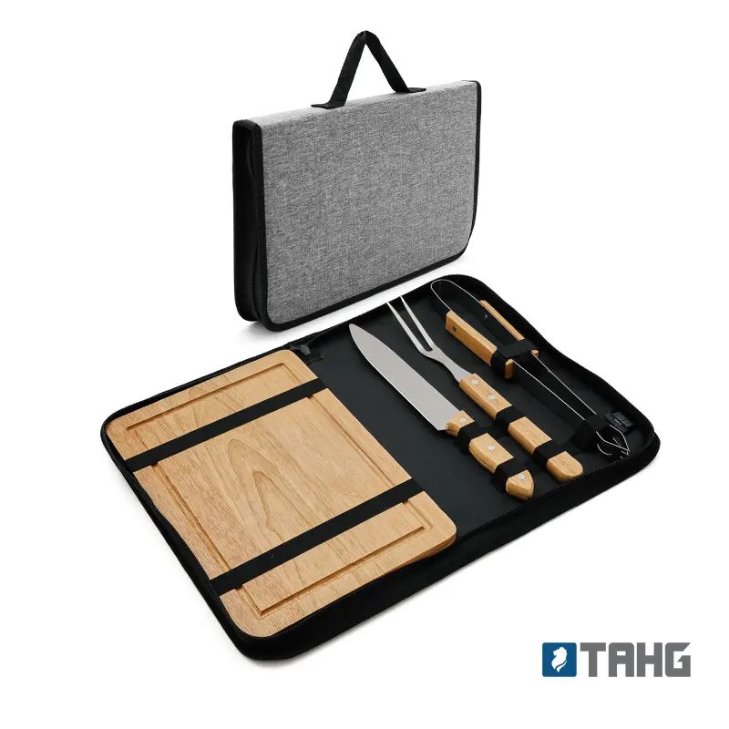 El Set BBQ Brasa es ideal para tus parrilladas y asados. Contiene: 1 tabla, 1 cuchillo, 1 tenedor y 1 pinza. Viene presentado en un estuche de poliéster de alta calidad, perfecto para almacenar y transportar tus utensilios.