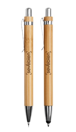 Bambú. Set de bolígrafo y lápiz mecánico. Cuerpo de bambú. Clip metálico. Puntera y pulsador de plástico. Tinta negra. El bolígrafo con puntera touch. En caja de cartón que simula ser madera.