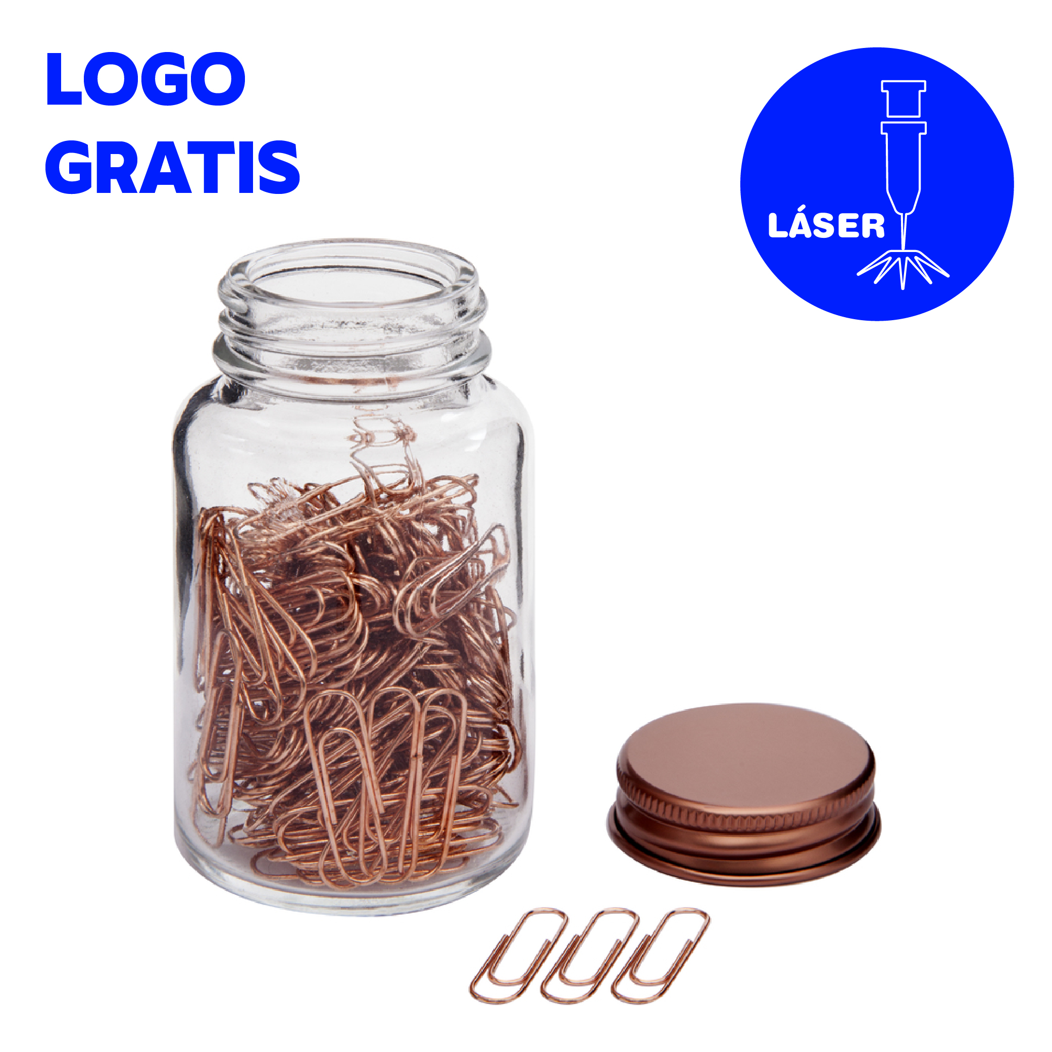 Ø 4,5 x 8,5 cm. Vidrio y metal. Set de clips metálicos en frasco de vidrio con tapa metálica.