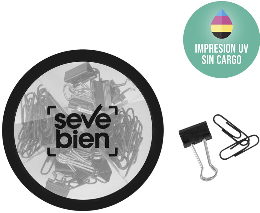 Ø 10 x 7,3 cm. Plástico. Set con clips plásticos color negro y sujeta papeles. Caja plástica redonda, la apertura es giratoria y el contorno es engomado para poder apoyar el celular. 10 sujeta papeles chicos, 5 sujeta papeles grande y 80 clips. Presentación en caja de regalo.