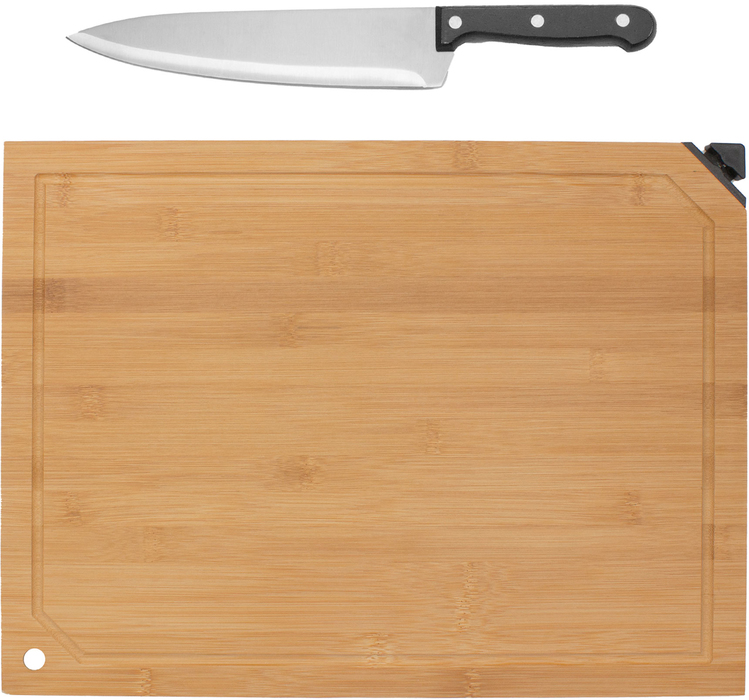 40 x 30 x 1.2 cm. Bambú. Set de corte. Tabla de Bambú con afilador incorporado y cuchillo. Cuchillo de acero inoxidable con mango en madera color negro de 32.5 cm . Afilador de plástico y acero de 5 x 2,4 x 1,2 cm. Presentación en caja de regalo.