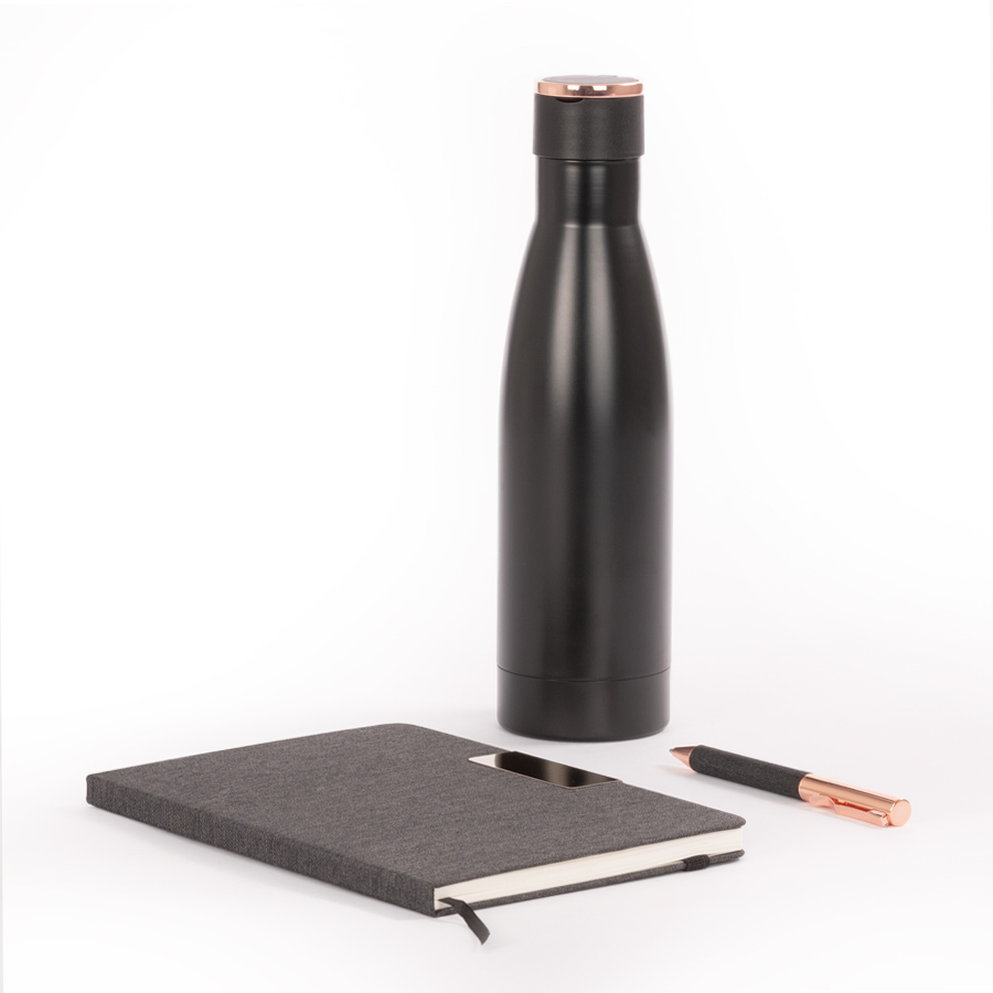 Set de Regalo incluye Termo 550 cc. producto BPA FREE, para el contacto con líquidos y alimentos, con tapa twist-off y asa redonda encobrizada + Cuaderno tapa dura recubierta en tela Oxford negro, con cierre elasticado y detalle metálico encobrizado, interior 80 hojas punteadas (dotted) color ivory (hueso) + Bolígrafo metálico encobrizado con tela Oxford negra, escritura negra . Presentación en elegante caja de carton color negro con tapa, interior cuna de EVA aterciopelada negra. Sobre funda de papel negro.