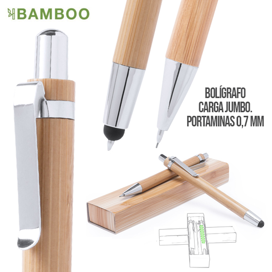 Set de bolígrafo de mecanismo pulsador y portaminas en original combinación de cuerpo en madera de bambú natural y accesorios de acabado metálico en color plateado brillante. Presentado en estuche individual troquelado de cartón brillante con acabado símil madera. Bolígrafo de cartucho jumbo con tinta azul y portaminas con minas de 0,7mm incluidas. Bolígrafo Carga Jumbo. Portaminas: Minas 0,7 mm Incluidas
