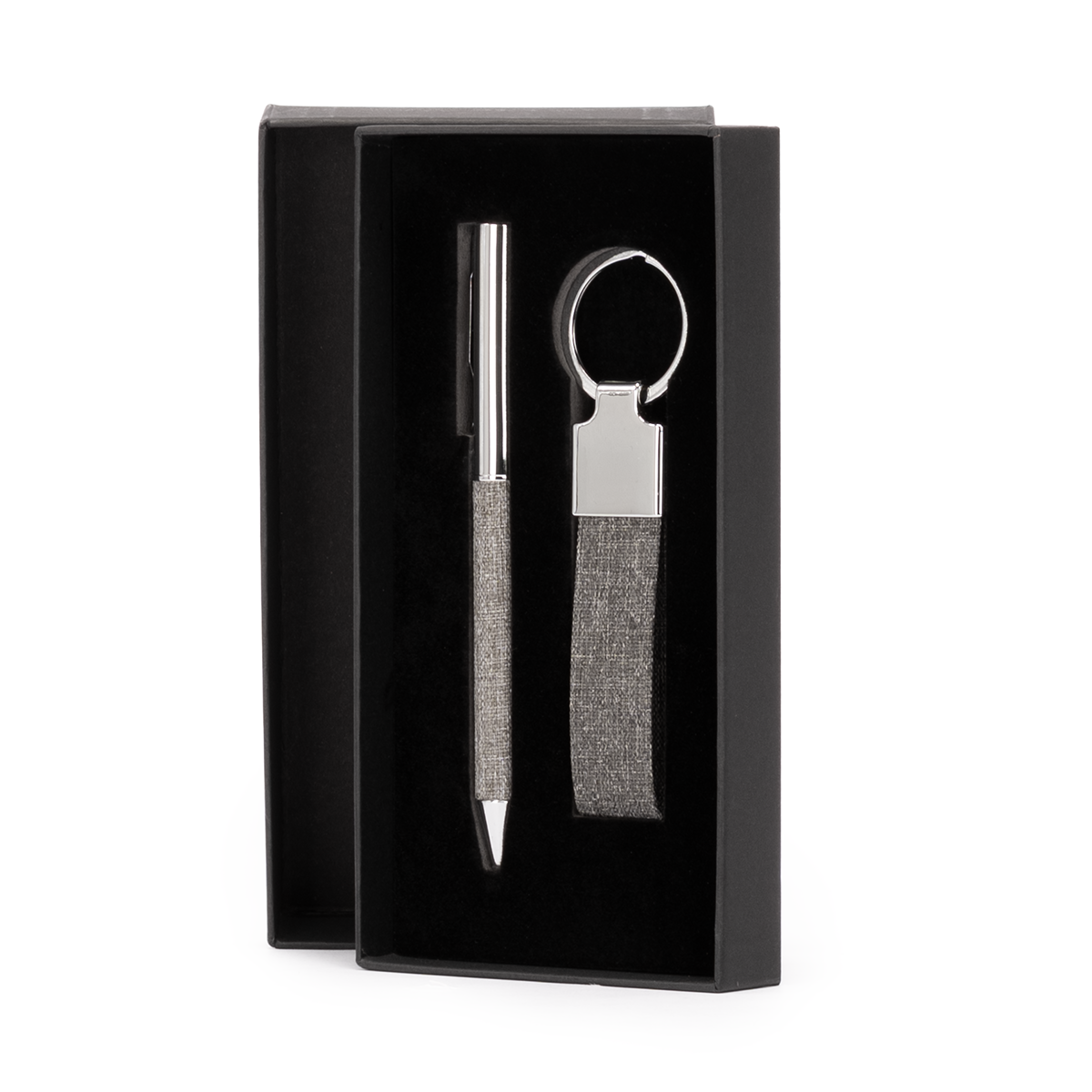 KALANI combina funcionalidad y diseño en un set compuesto por bolígrafo metálico y llavero revestidos en tela RPET gris. Cada elemento está cuidadosamente empacado en una caja negra que proyecta sobriedad y profesionalismo. El RPET proviene de botellas recicladas, dándole una segunda vida al plástico y reforzando el mensaje de cambio desde lo cotidiano. Coloca tu logo y convierte este set en una expresión tangible del compromiso de tu marca con un futuro responsable.