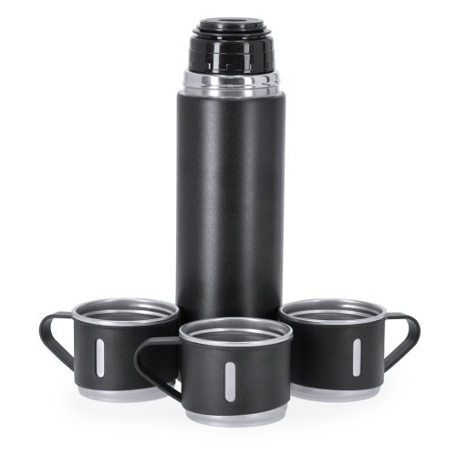 Set de termo con 3 tazas fabricado en acero inox. Termo de 420 ml de capacidad y de doble pared, que garantiza una mejor y más duradera conservación de la temperatura, con dosificador de seguridad. Tazas de 140ml, ajustables mediante rosca y en elegante diseño negro, ideales para disfrutar de la bebida, ya sea caliente o fría, en cualquier momento y lugar. Presentación en elegante estuche de color negro. Termo 420 ml. 3 Tazas 140 ml