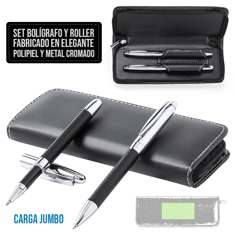 Set premium de bolígrafo y roller. Fabricado en elegante combinación de polipiel en tonos negros y metal cromado. Bolígrafo de mecanismo giratorio en tinta azul y con cartucho jumbo. Roller con capucha y tinta gel en azul, carga jumbo. Presentado en estuche individual de polipiel con cierre de cremallera e interior a juego con compartimentos individuales. Bolígrafo y Roller. Carga Jumbo