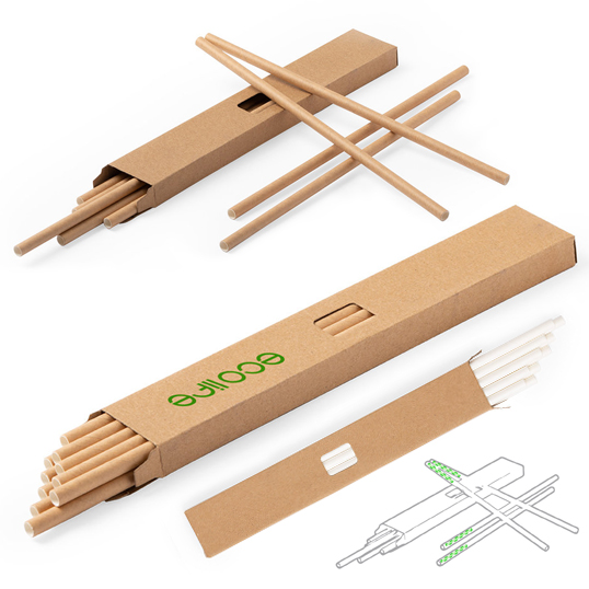 Set de pajitas de papel con tratamiento especial anti humedad. Compuesto por 10 pajitas, presentadas en estuche de cartón reciclado. Disponible en acabado natural y marrón. 10 Piezas