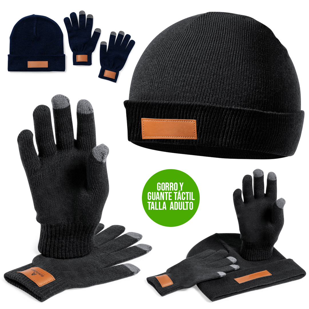 Set de gorro y guantes en talla adulto, fabricados en material acrílico elástico y con parche en polipiel cosido para marcaje. Incluye: Par de guantes con 3 dedos táctiles y elástico de ajuste en muñeca. Gorro a juego con dobladillo. Gorro y Guante Táctil. Talla Única. Adulto