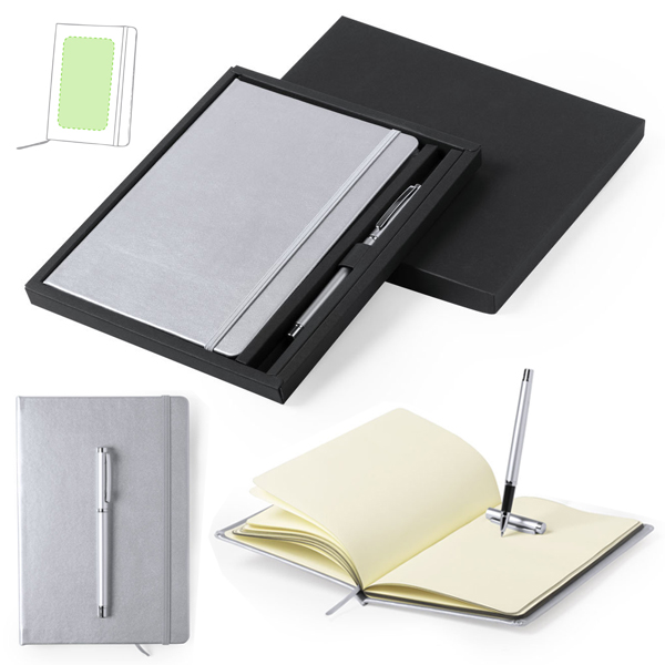 Set de bloc de notas con tapas de suave tacto acabadas en polipiel de tono plateado y roller de aluminio a juego. De 80 hojas lisas con elástico de sujeción y marcapáginas de tela a juego. Presentado en elegante estuche de cartón troquelado. Roller en tinta azul. Portada Rígida. 80 Hojas. Roller Aluminio. Carga Jumbo