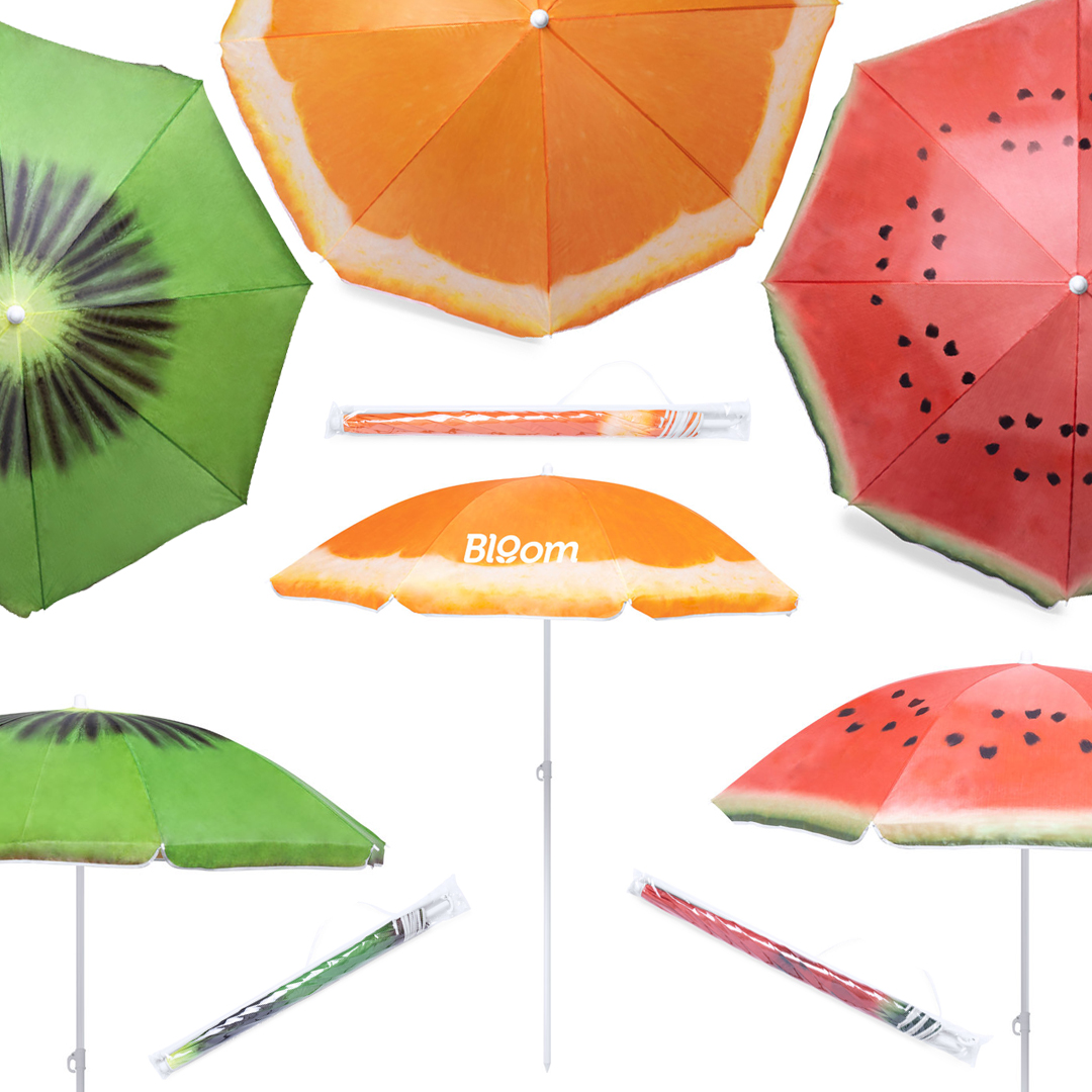 Colorida sombrilla de playa con diseños frutales. 150 cm de diámetro, con 8 paneles en resistente nylon y faldones laterales ribeteados. Tubos metalizados en color blanco y ajustable en altura. Presentada en funda transparente con cinta de transporte para hombro. Funda PVC