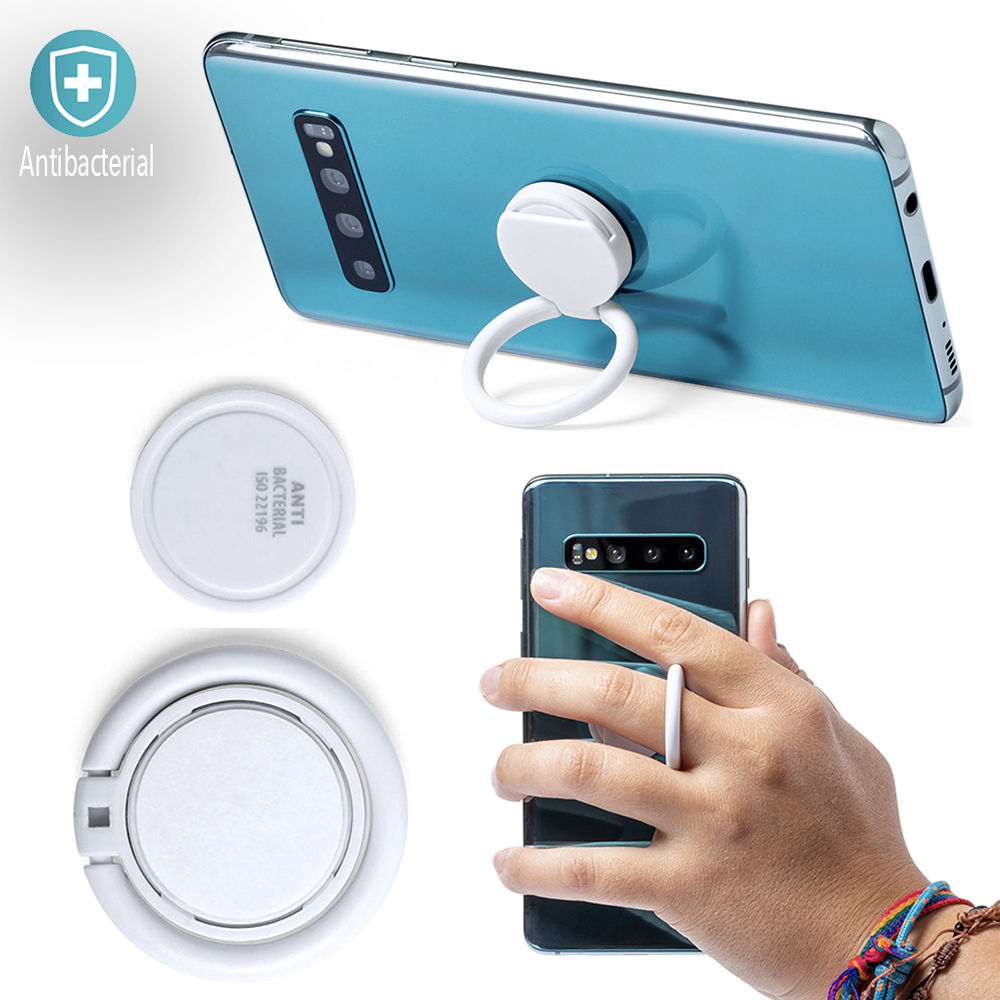 Soporte antibacteriano con adhesivo 3M extra fuerte. Ideal para smartphone, con moneda para carro integrada y anilla posterior 360º para el dedo, válida como soporte y accesorio para selfies.Los productos con tratamientos antibacterianos son capaces de reducir drásticamente las cargas bacterianas presentes en las superficies de los materiales, gracias a la incorporación de agentes microbianos permanentes estáticos, con alta efectividad para inhibir y prevenir la contaminación bacteriana.Artículo de acuerdo al estándar ISO 22196, que determina la actividad antibacteriana en materiales plásticos y superficies no porosas, lo que permite conocer la efectividad de inhibición microbiana que tienen los aditivos sobre los objetos tratados mediante una evaluación cuantitativa. Adhesivo. 3 Funciones
