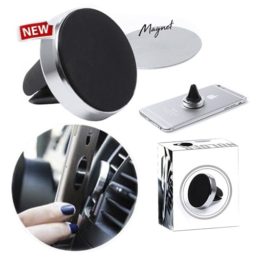 Soporte magnético para smartphone de diseño minimalista y elegante acabado en aluminio. Con sistema de fijación para rejilla de ventilación del automóvil y pastilla circular frontal especialmente diseñada para marcaje en tampografía. Adhesivo y Magnético