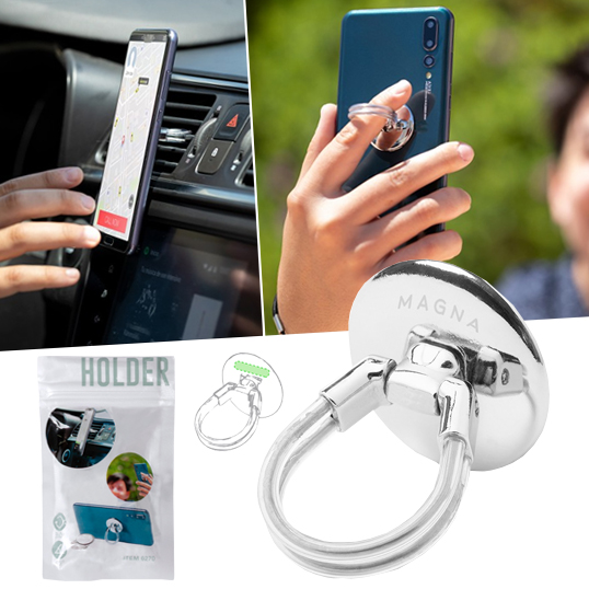 Soporte selfie en metal cromado para smartphone. De elegante diseño y con adhesivo 3M, de fijación extra fuerte y libre de residuos al despegarlo del dispositivo. Con doble anilla soporte posterior, para dedo y rejilla del salpicadero del vehículo. Presentado bolsita de diseño individual. Adhesivo