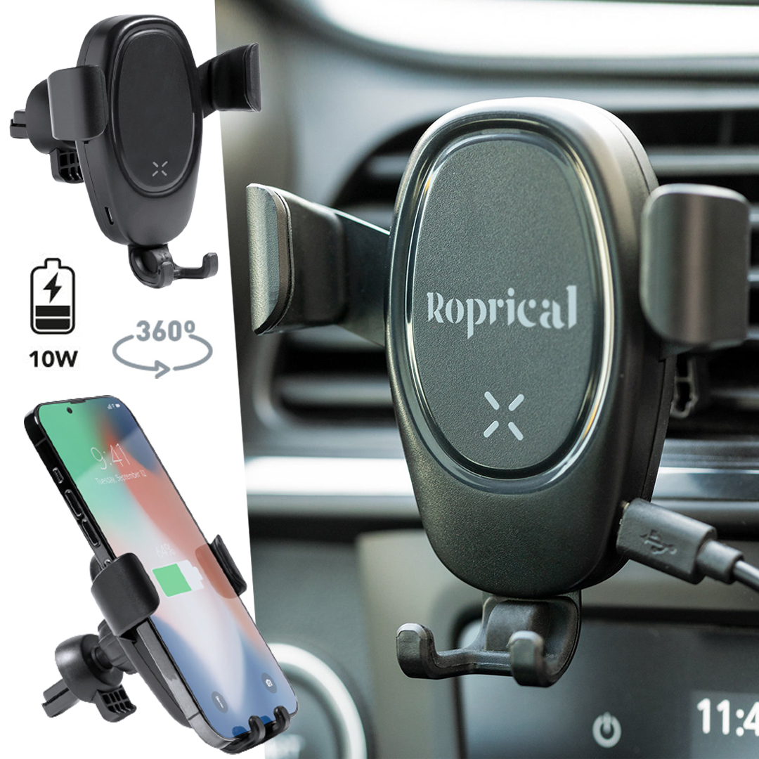 Soporte de rejilla de coche para smartphone con cargador inalámbrico 10W integrado. Mecanismo de ajuste automático universal para poder usar el dispositivo mientras se está cargando. Compatible con dispositivos equipados con tecnología de carga inalámbrica. Presentado en atractiva caja individual de diseño. Inalámbrico 10W. Ajustable