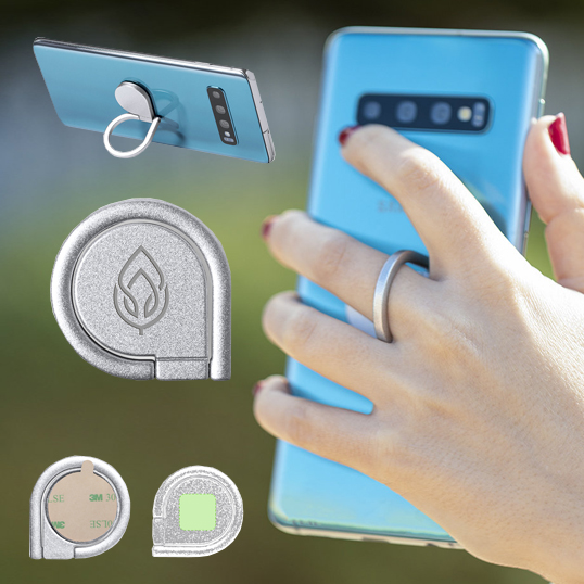 Soporte metálico para smartphone en acabado mate. De elegante diseño y con adhesivo 3M, de fijación extra fuerte y libre de residuos al despegarlo del dispositivo. Con anilla soporte posterior para dedo y presentado en bolsita individual de diseño. Adhesivo
