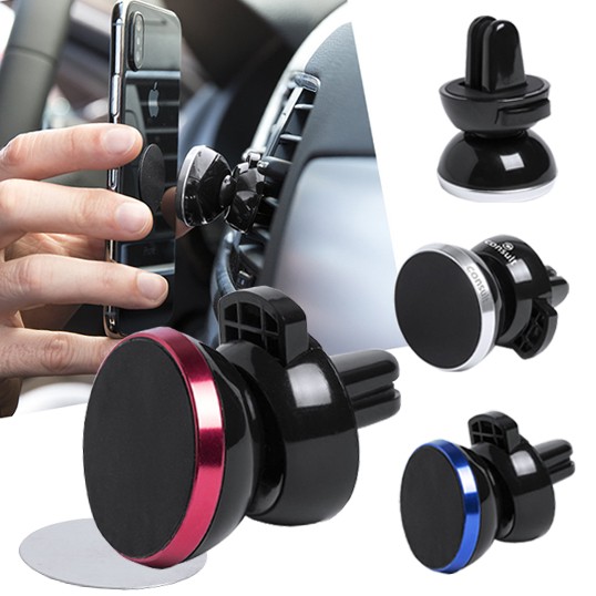 Soporte magnético para smartphone de diseño minimalista y elegante acabado en aluminio negro en combinación con llamativos colores metalizados. Con sistema de fijación telescópico para rejilla de ventilación del automóvil y accesorio adhesivo para smartphone. Presentado en atractiva caja de diseño. Adhesivo y Magnético