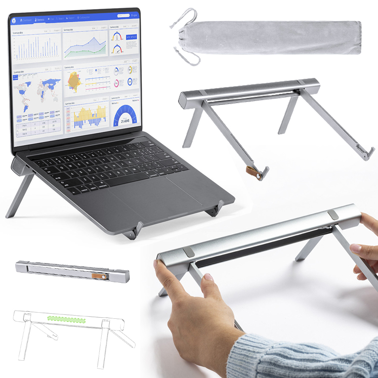 Soporte plegable para ordenador portátil de calidad premium. Fabricado en resistente aluminio, incluye patas extensibles y regulables en altura, con protecciones de goma para un firme ajuste al ordenador y al escritorio. Plegado de tamaño compacto presentado en funda de antelina con cierre de cordón y en caja individual de diseño. Plegable. Altura Regulable. Funda Antelina