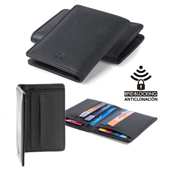 Tarjetero con tecnología de seguridad RFID (Identificación por Radio Frecuencia) que mantiene seguros tus dispositivos de transmisión de identidad. De elegante diseño, suave acabado en polipiel negra y con 8 compartimentos. Presentado en caja individual. Protector RFID. 8 Compartimentos