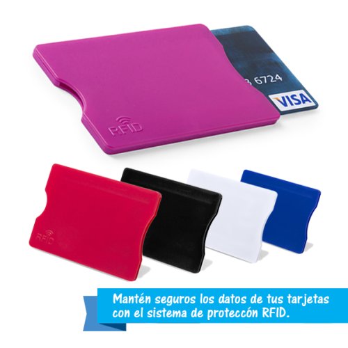 Tarjetero con tecnología de seguridad RFID (Identificación por Radio Frecuencia) que mantiene seguros tus dispositivos de transmisión de identidad. Resistente cuerpo de suave acabado y en desenfadados colores, con muesca para fácil acceso a la tarjeta. Presentado en bolsita individual de diseño. Protector RFID. 1 Compartimento