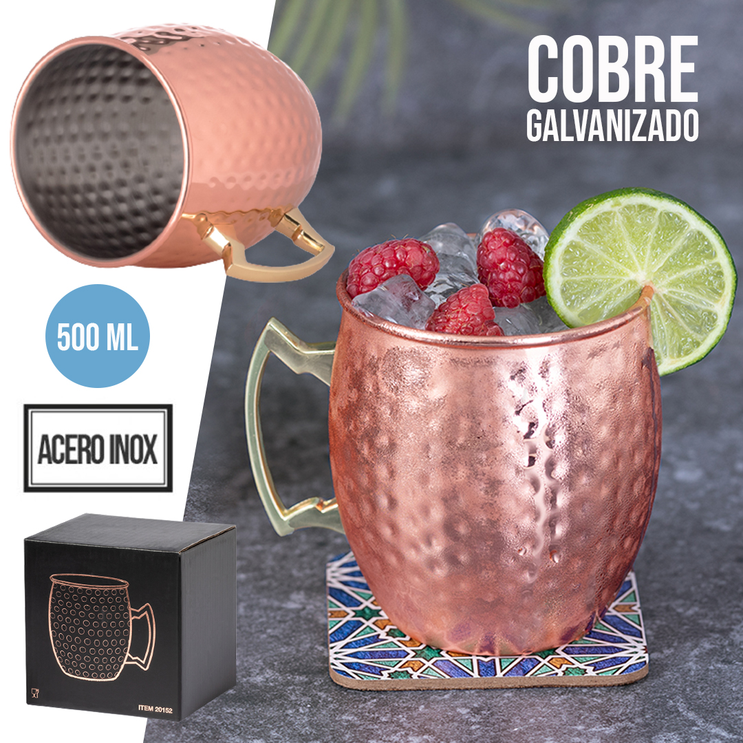 Taza de 500 ml de capacidad en acero inox con recubrimiento exterior de cobre galvanizado. Original diseño con acabado brillante, vintage y elegante. Presentada en exclusiva caja individual de diseño negra. 500 ml