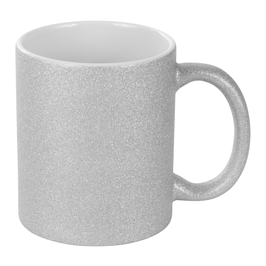 Tazón cerámico de 11oz (325cc) con superficie exterior glitter plateado, para Sublimación. Incluye caja blanca de Cartón color plata.