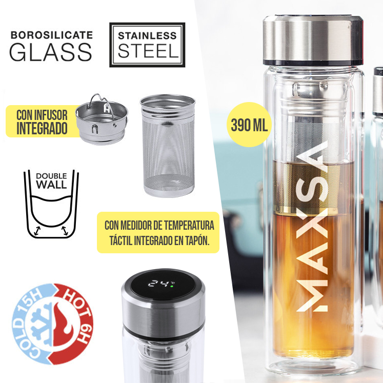 Termo en alta calidad de doble pared y 390ml de capacidad, con medidor de temperatura táctil integrado en tapón. Fabricado en cristal de borosilicato, que ofrece una resistencia y durabilidad excepcionales, alargando su vida útil y pudiendo ser reutilizado infinidad de veces. Tapón en acero inox con infusor integrado y libre de BPA. Alimentación a pilas (de botón incluida) y disponible manual de instrucciones en español e inglés. Presentado en atractiva caja de diseño. 390 ml. Medidor Temperatura Táctil. Doble Infusor Incluido