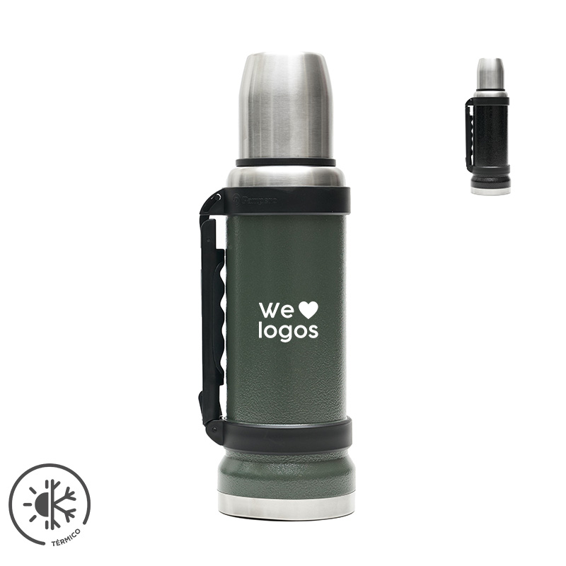 Termo de acero inoxidable 304, recubierto con esmalte especial que protege de ralladuras y golpes. Puede mantener el contenido a la misma temperatura durante 18hs, gracias a su doble pared aislante especial de acero. Cuenta con un tapón cebador Hermético a rosca con la función anti derrame y tapa con superficie plana estable para usar como taza o vaso y manija plegable para facilitar el transporte. Presentado en caja de cartón. Medidas del termo: 34 cm x 10,5 cm. Medidas de la caja: 35 x 11 x 11 cm. Capacidad: 1,1 Lts.