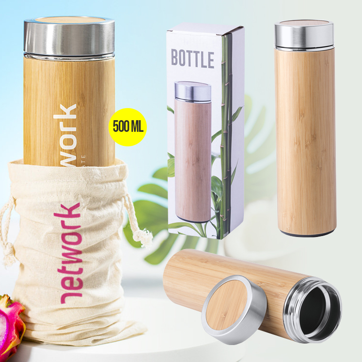 Termo en alta calidad y 500 ml de capacidad, con cuerpo acabado en bambú e interior en acero inox. Tapón de seguridad a rosca en acero inox y bambú. Presentado en una atractiva caja de diseño. 500 ml