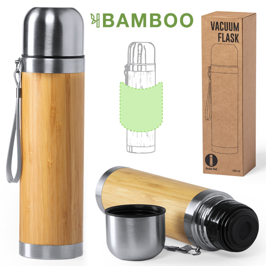 Termo de línea nature en combinación de materiales bambú y acero inox, libre de BPA. 420 ml de capacidad, con doble cobertura para mejor y más duradera conservación de la temperatura. Cierre a rosca, con tapón taza en acero inox y cómoda cinta de transporte. Presentado en atractiva caja de diseño eco. 420 ml