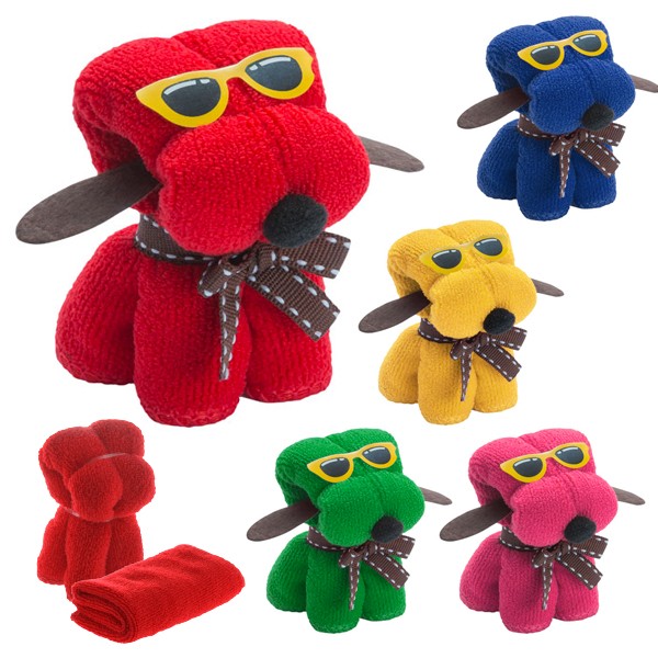 Divertida toalla perro en absorbente y suave microfibra de 310g/m2 en vivos colores. Presentada en estuche de PVC transparente de diseño.