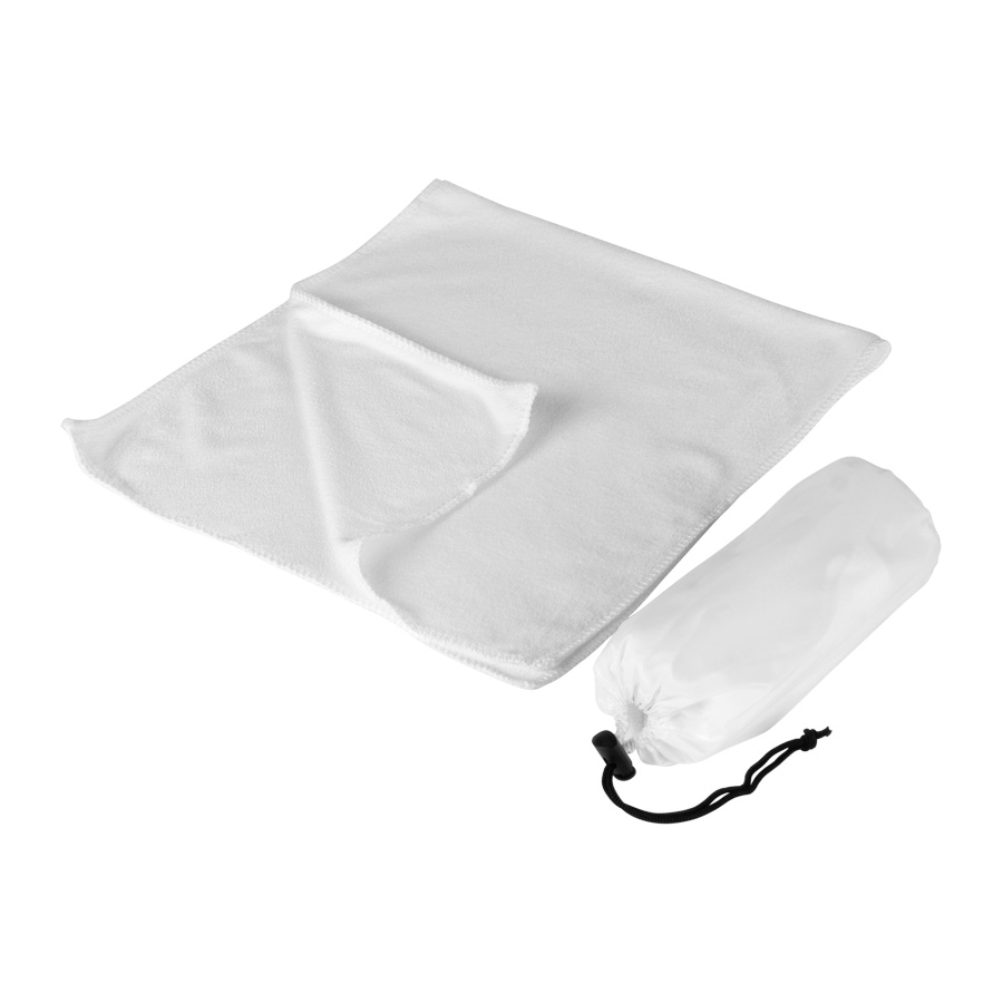 Toalla deportiva en tela Microfibra para Sublimación. Presentación dentro de bolsito de nylon 190D/PU.