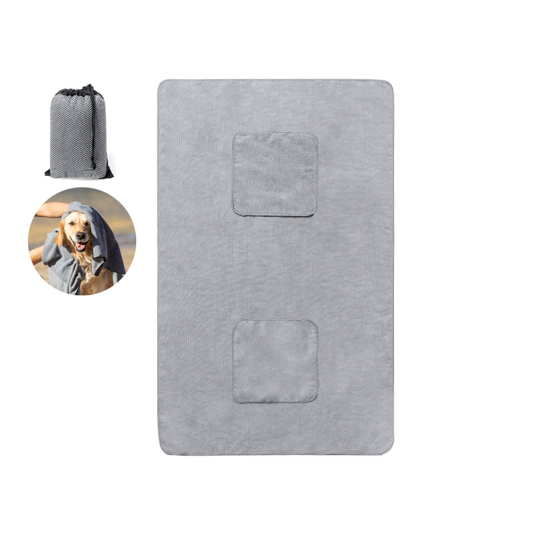 Toalla para mascotas fabricada en resistente poliéster de 160g/m2. Medida 66 x 106 cm, con dos prácticos bolsillos para las manos, facilitando así el secado de la mascota. Presentación en funda individual de redecilla con cierre de cordón y ajustador. Funda Poliéster