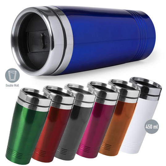 Vaso en acero inox de 450ml de capacidad. Con doble cobertura para mejor y mas duradera conservación de la temperatura. Con tapa y base acolchada de suave espuma. Disponible en variada gama de colores metalizados y presentado en atractiva caja de diseño. 450 ml