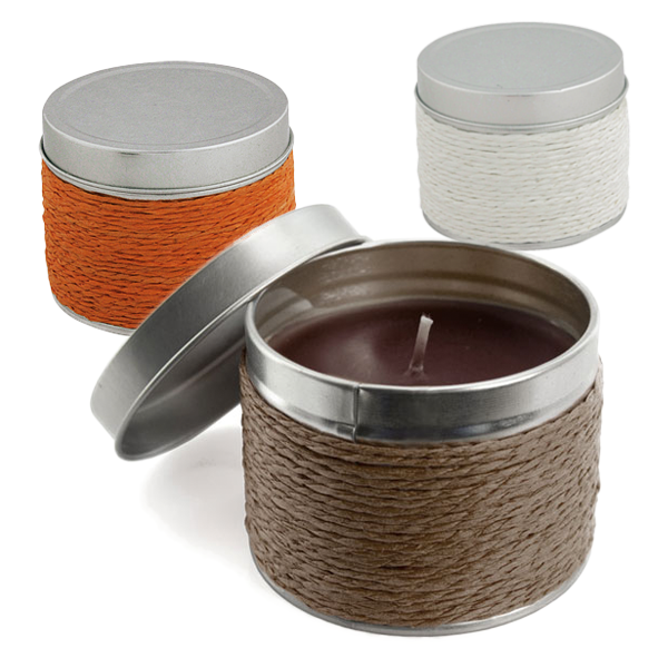 Vela aromática con envase metálico y cuerpo revestido de hilo en variada gama de colores. Disponible en aromas vainilla, naranja y chocolate.