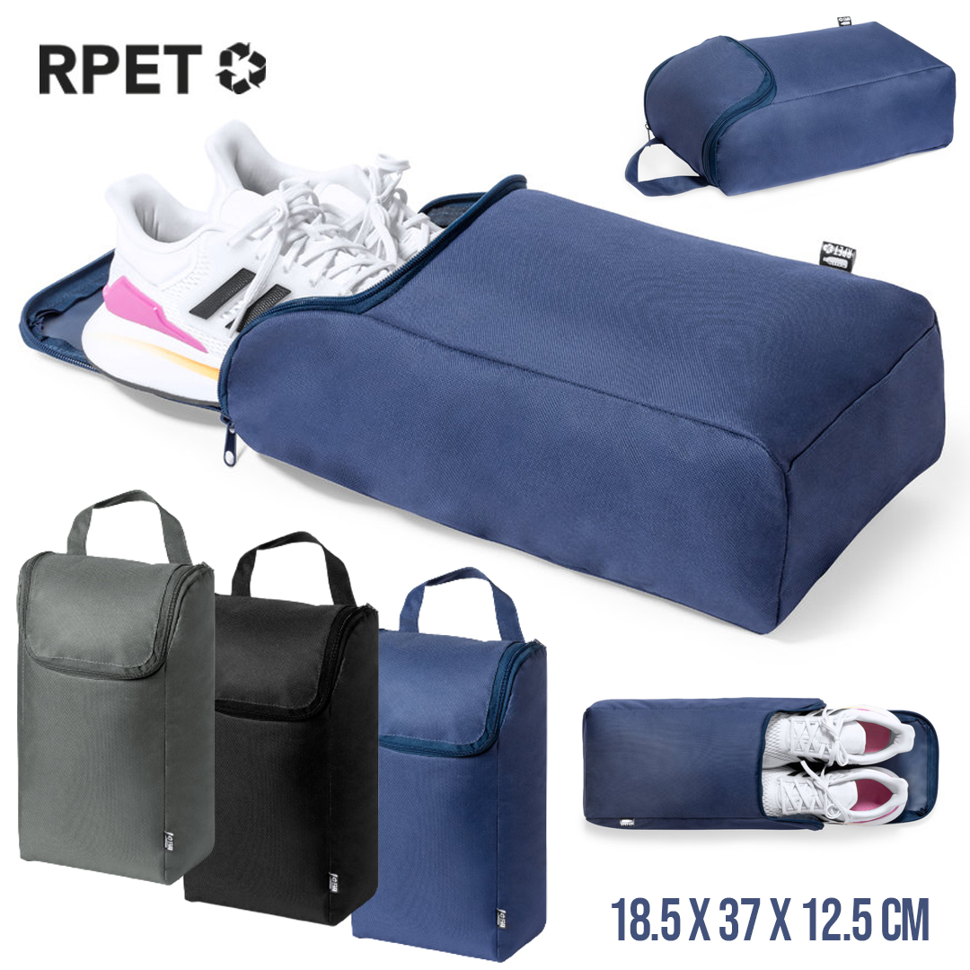 Práctico zapatillero de línea nature fabricado en 600D RPET. Con cierre de cremallera a juego e interior reforzado. Disponible en variada gama de colores y etiqueta exterior con distintivo RPET.El material RPET se elabora a partir de plástico reciclado, para así fomentar la reutilización de residuos plásticos y ayudar a la sostenibilidad del planeta.